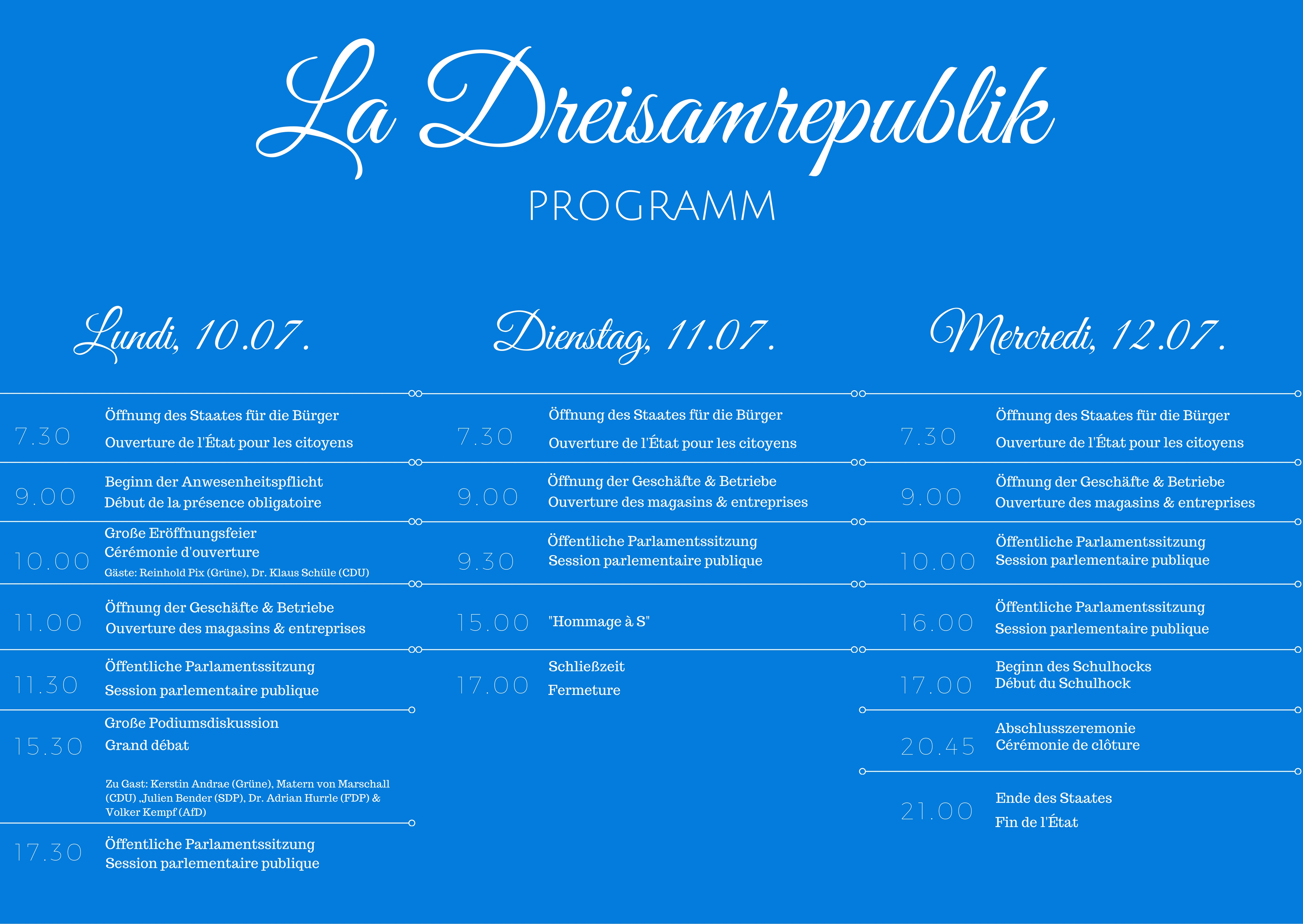 Und das können Sie erleben und machen, wenn sie sich in der Dreisamrepublik aufhalten.Neben politischen Veranstaltungen (Näheres finden Sie im Programm) und Parlamentssitzungen gibt es Konzerte und andere künstlerische Darbietungen auf einer Kleinbühne. Daneben gibt es Handwerksbetriebe, die verschiedene Waren anbieten, die alle in Handarbeit hergestellt werden, und einen Kleiderladen. In einem Nähstudio können Sie selbstgenähte Produkte erwerben oder Ihre Kleider ändern oder flicken lassen. Auf Anfrage werden hier auch ihre Hemden von zu Hause gebügelt. Eine Autoreinigung reinigt den Innenraum Ihres Autos während Ihres Besuches. Sie können ins Kino gehen oder Ihr Glück bei einer Lotterie oder im Casino versuchen, sich in einer Nerf-Battle messen oder Computer-Spiele aus Ihrer Kindheit im Retro-Cafe spielen, sich ein Tattoo malen lassen, eine Fußmassage genießen, Ihre Frisur richten lassen, an einem Tanz- oder Yoga-Kurs teilnehmen oder in unserem Standesamt den Bund der Ehe eingehen - die Ehe für alle ist bei uns kein Problem. Für die, die es eher verrückt wünschen, gibt es auch die Möglichkeit des crazy wedding. In unseren zahlreichen Cafes können Sie Kaffee und Kuchen genießen und am Vormittag auch ausgiebig frühstücken. Unsere Apotheke bietet selbstgemachte homöopathische Mittel und Salben, im Bio-Kräuterladen gibt es alles rund um die Kräuter. Für ein gemütliches Mittagessen stehen internationale Restaurants, eine Crêperie, Burger-Restaurants und ein Biergarten zu Ihrer Verfügung. In unseren Backstuben gibt es selbst gebackene Spezialitäten und auch Brot zu kaufen. Am Dienstag gibt die Big Band um 11h30 ein Konzert, um 15h30 gibt es unter dem Titel "Homage à S." ein Konzert mit zahlreichen hochtalentierten Schülern und dem Chor.